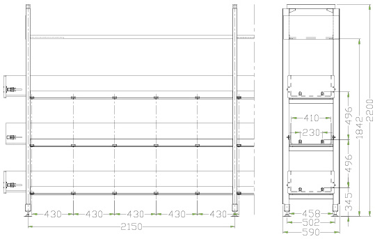 ● 主要尺寸:590x2200x2150(寬x高x柱距),345-496-496(層間距)